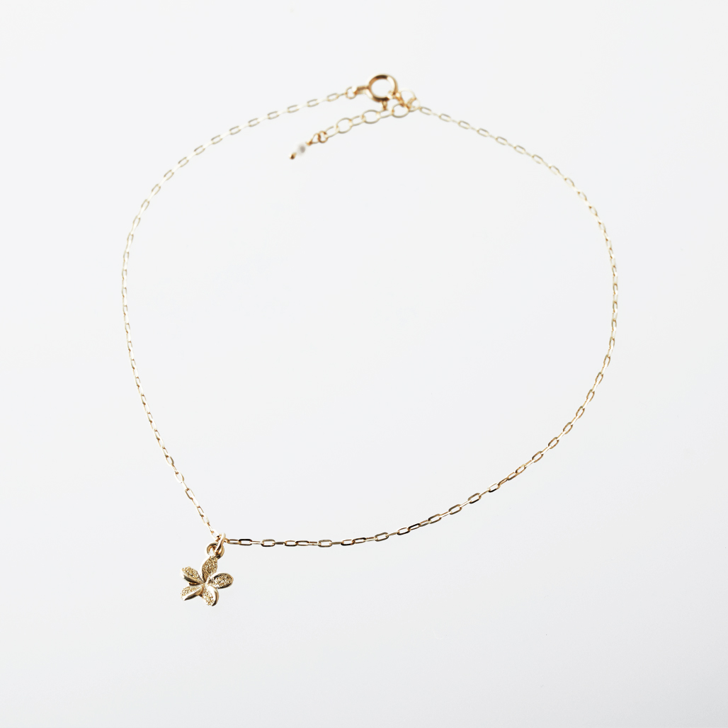 ハワイアンジュエリーの中でも、特に人気が高いプルメリア。ふっくらとした花びらと優しい曲線が、どこか懐かしく温かい印象を与えてくれます。