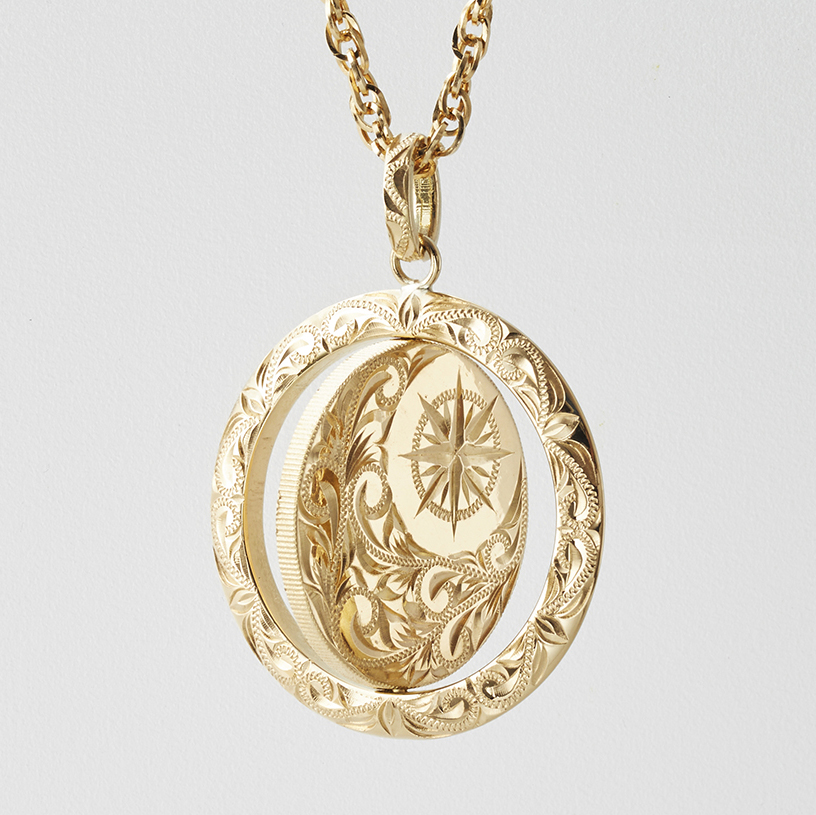 マカルアペンダントとは、羅針盤(コンパス)をイメージした、どこか懐かしく、アンティークなデザインのペンダントです。水平を出すために回転する羅針盤のイメージをダブルフェイスとダブルエッジを自由に回転させることで表現してみました。