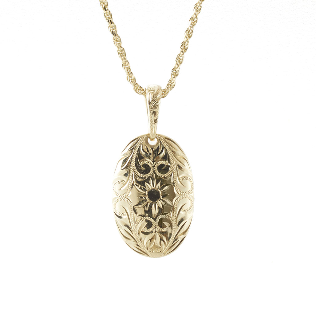 ペンダントの形は少し縦長のオーバル型。縁にはスクロール(波模様)とミルグレインが施されており、クラシカルな雰囲気を演出しています。裏面には太陽とスクロールが入っていてリバーシブル仕様と贅沢な仕上がりです。