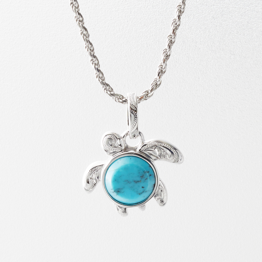 ハワイでは、ホヌは、「神の使い」「海の守り神」として大切にされています。平和や長寿を意味し、ホヌを見ると‘’良いことがある‘’といわれるほど。そんな神聖なホヌの背中に、美しくカットされたターコイズをセットしたのがホヌプナヘレ・ターコイズペンダントです。