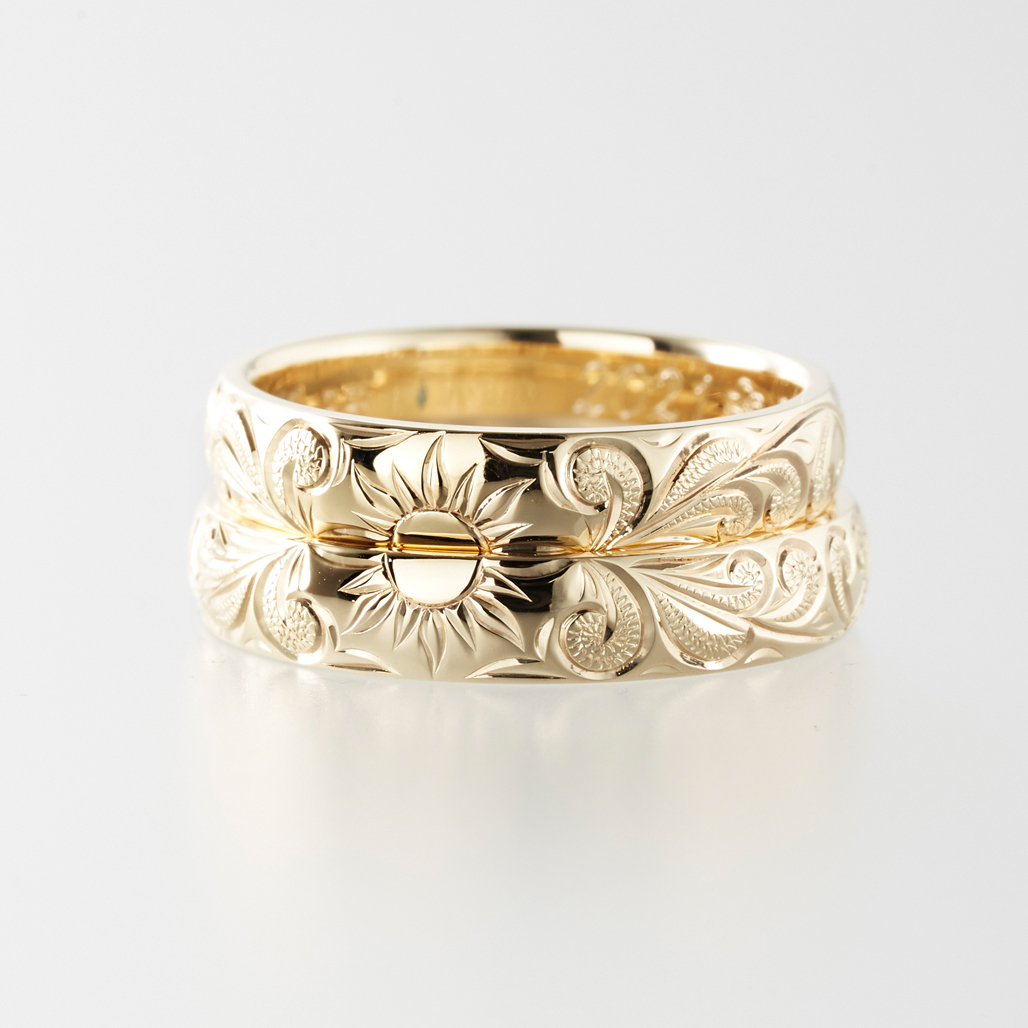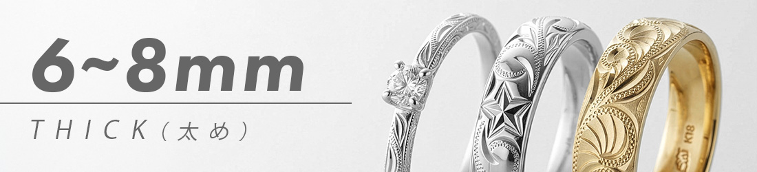 彫りデザインによっても印象が大きく変わるので、幅×モチーフのバランスを見るのがポイント。幅広はどんな柄でもしっかり見えて手元に輝く彫り柄を楽しめます。細めのリングの場合はシンプルな彫り柄と相性が良く、美しく見えるデザインをご提案させていただきます。