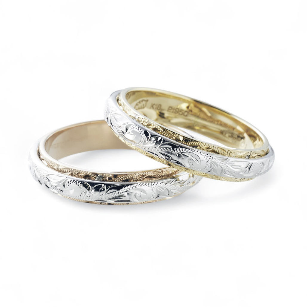 K14ゴールドとプラチナの鍛造の板で1つのリングを作って圧着させており、上品な印象でありながらも存在感を楽しめます。