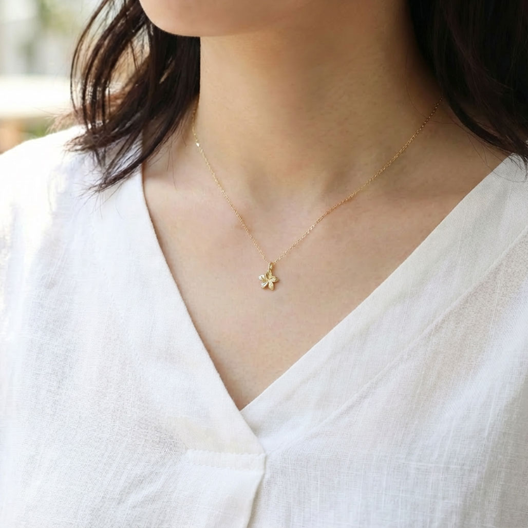 そのやさしく上品な美しさを、日常にそっと寄り添うジュエリーとして仕立てたK10 プルメリア ミロ イエローゴールドネックレスが誕生しました。