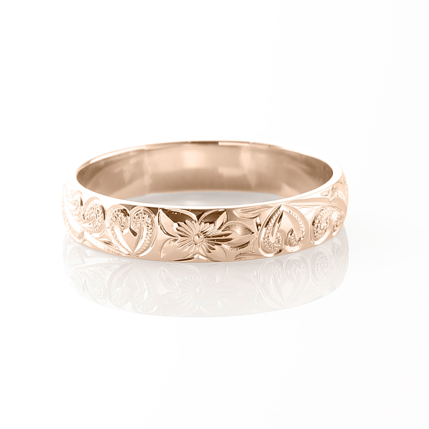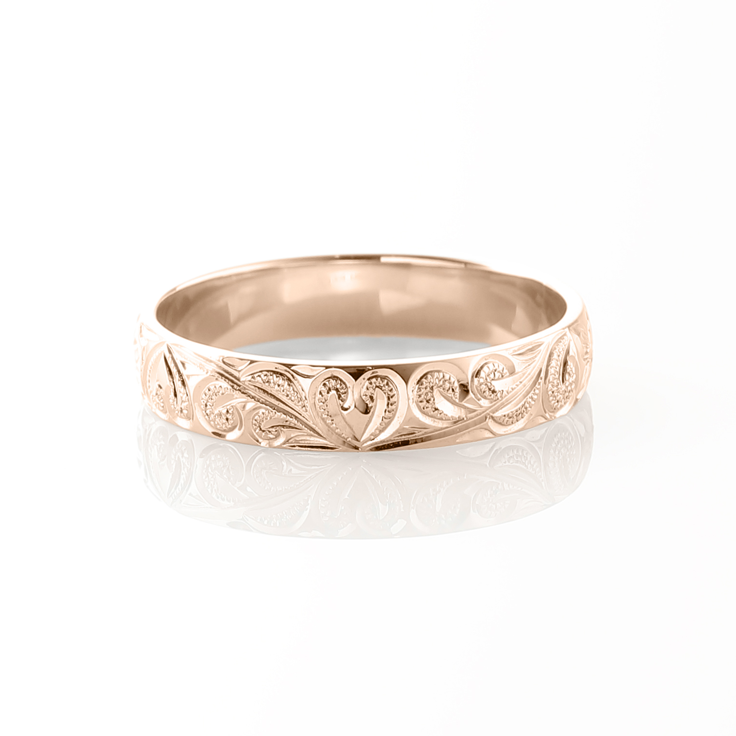 この鍛造製法によって生み出される美しい地金の上に、さらにハワイアンジュエリーならではの立体的な手彫りを施した、まさに贅沢な結婚指輪です。