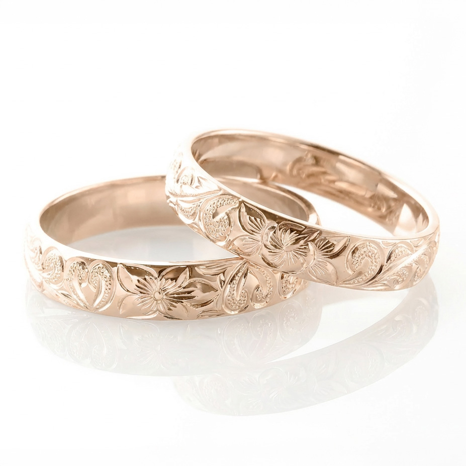 〔K14ピンクゴールド〕愛の波とハワイの花々/マナオラナ4mmリング